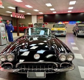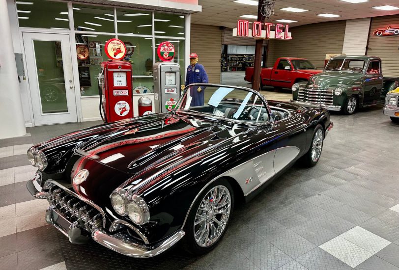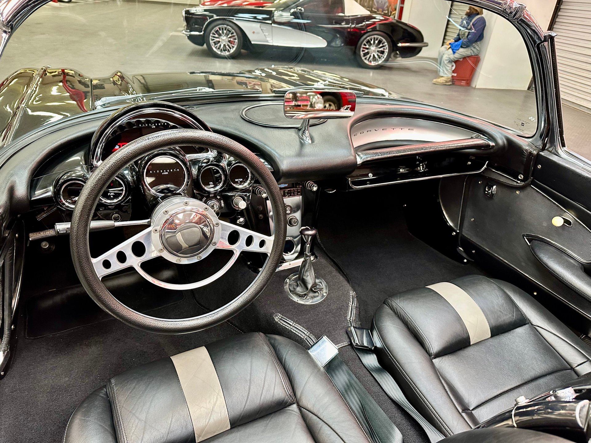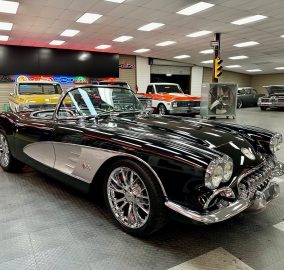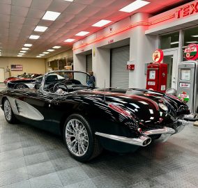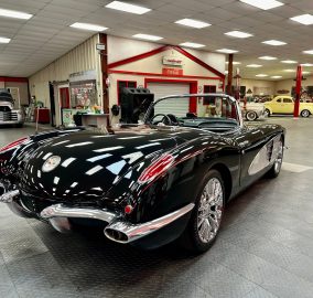 1959 Chevrolet Corvette Resto-Mod finished in glossy black with black leather interior and cloth top. Features include a custom tube chassis, LT1 engine with automatic overdrive, power steering, 4-wheel disc brakes, A/C, power windows, tilt wheel, and Dakota Digital dash. Rides on new 17" Corvette Z06-style wheels.